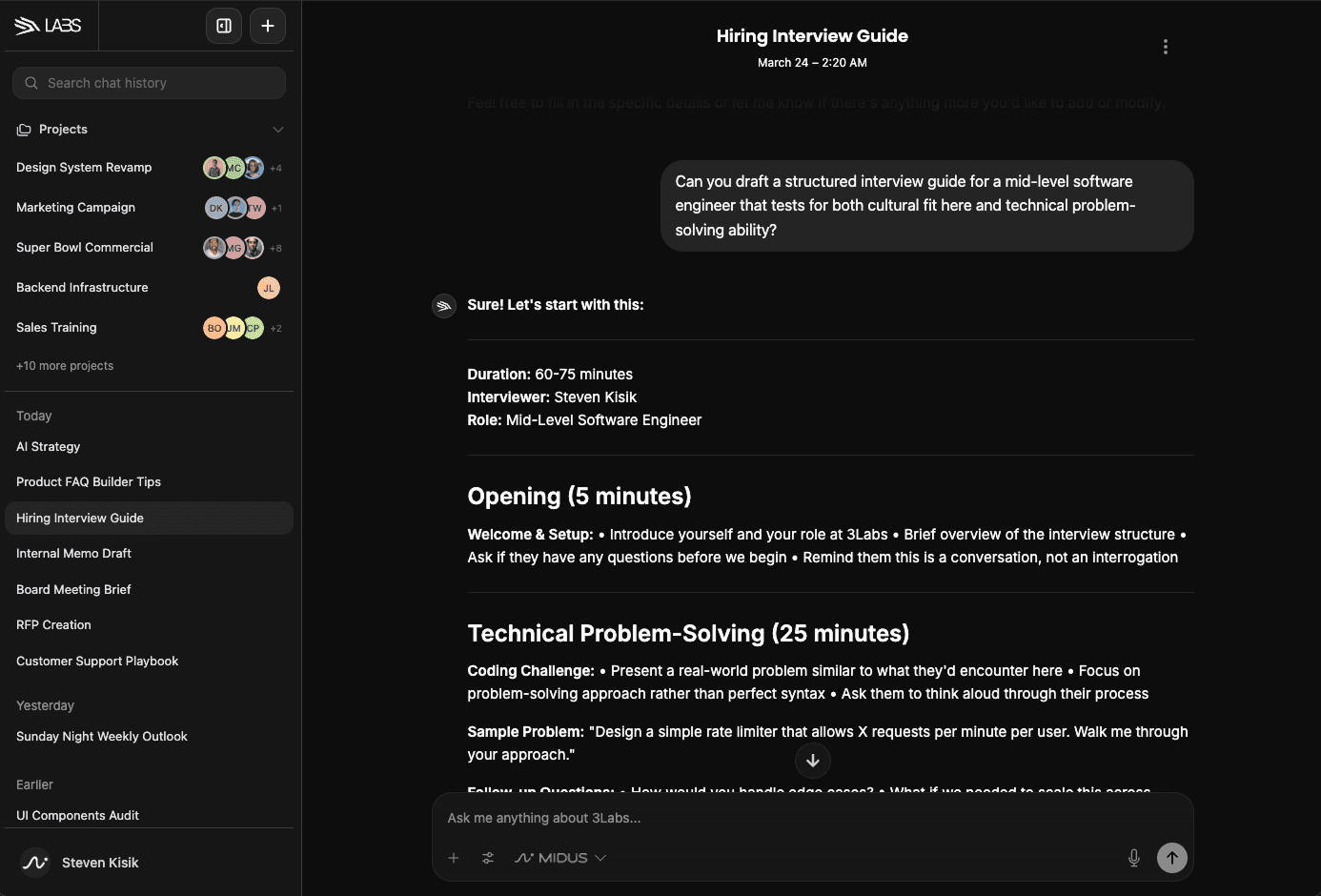 Midus adapts directly to how your organization operates. Each project gets its own dedicated AI workspace where members collaborate in real-time. Organize conversations by projects, invite team members to join chats, and upload exactly the resources your agent needs to fully understand each task.